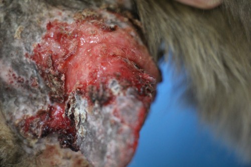 Photo 1 : profil, large ulcération du pavillon G, squamo-croûtes étendues, alopécie faciale et cervicale