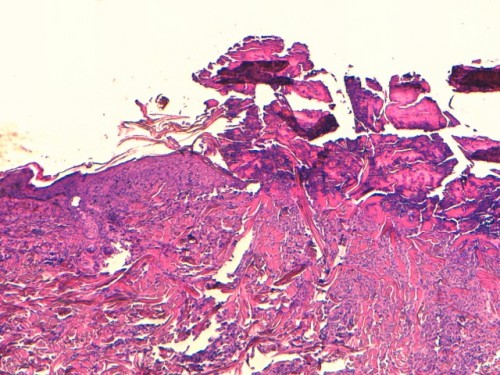 Photo 4 : (HE*40), lésions pyotraumatiques multifocales de l’épiderme, épaisses croûtes avec amas bactériens bleutés