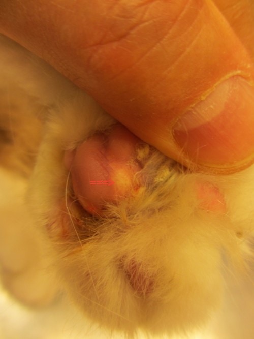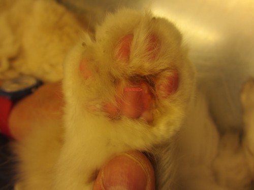 Quatre ans après la découverte de son IRC sont repérées des lésions au niveau des coussinets notamment du postérieur gauche avec des ulcérations. Des calques sont effectués. Ils révèlent la présence de polynucléaires et de coques extracellulaires principalement. Une antibiothérapie (cefalexine PO et acide fusidique localement) est mise en place avec une amélioration des ulcérations. Trois mois plus tard une aggravation des lésions podales nous fait intervenir.