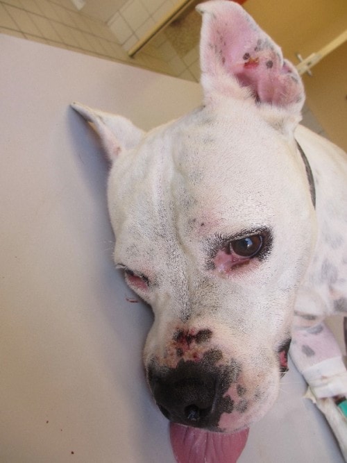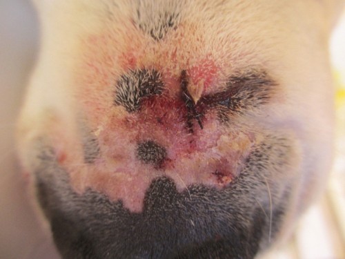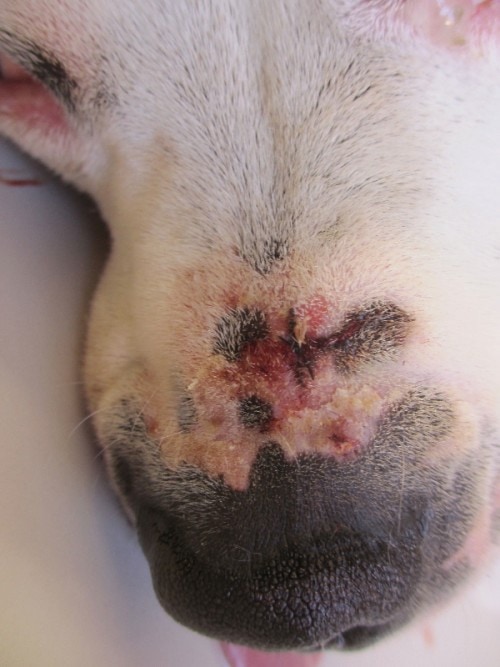 Nous sommes donc en présence d’une dermatose moyennement prurigineuse, érythématosquameuse, avec papules, ulcérations et croûtes principalement de la face même si un érythème diffus plus général est noté sur un American Staffortshire à poil blanc de 4 ans.