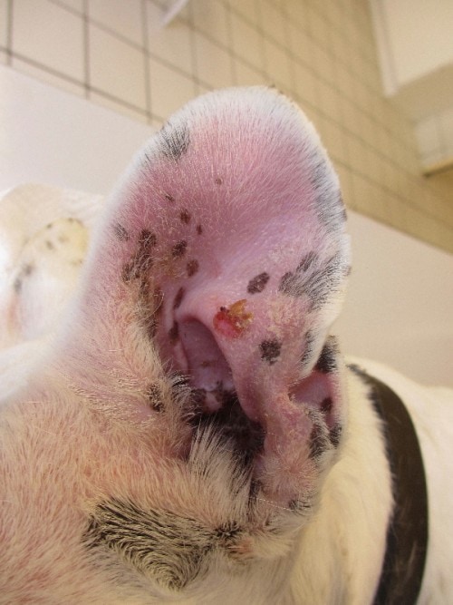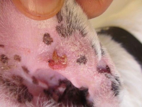 On note un érythème diffus des conques auriculaires, du chanfrein et des paupières. Cet érythème diffus se retrouve sur différentes parties du corps sans autre lésion. On trouve sur la face interne des pavillons auriculaires des plaques érythémateuses plus ou moins squameuses avec des ulcérations couvertes ou non des croûtes notamment au niveau du pli de l’oreille. Des papules ou papulocroûtes sont aussi présentes. On retrouve le même type de lésions sur le chanfrein et les paupières.