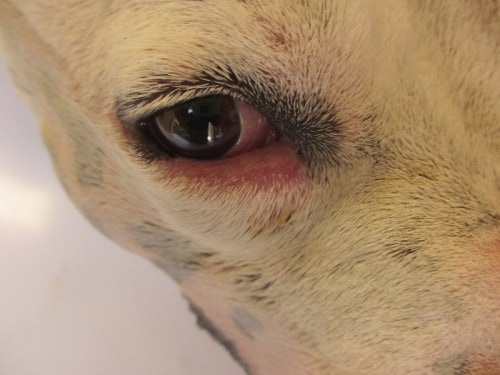 Il y a un an, au mois d’août, XO a présenté des croûtes sur le bord des oreilles traitées par antibiothérapie générale (amoxicilline acide clavulanique) qui a entrainé une amélioration. Retour des croûtes en janvier de cette année, après nouvel essai avec le même antibiotique sans effet, un passage aux corticoïdes par voie générale (prednisolone) a amené une amélioration sans guérison. En juin, une aggravation est notée avec atteinte des paupières et de la truffe.