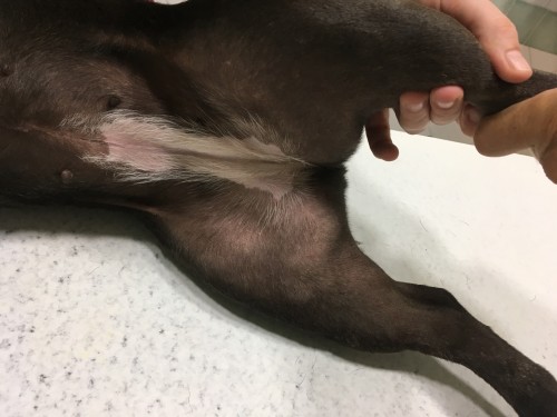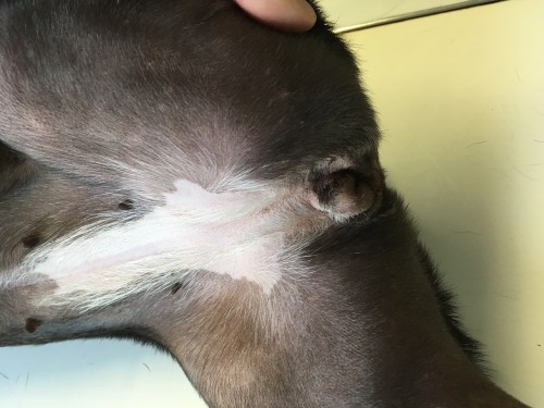 La chienne a été consultée tous les 15 jours. A la première visite de suivi, l’état cutané et le prurit ont rétrocédés au traitement rapidement (photos 7 à 9: « vues rapprochées des anciens sites lésés – noter la guérison clinique »).
