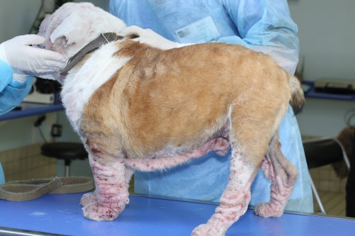 Un bouledogue anglais de 7 mois entier est admis pour une démodécie associée à une pyodermite. Il vit en maison avec un accès libre à l’extérieur sans congénère. Il est nourri avec une alimentation industrielle sèche de gamme vétérinaire et reçoit occasionnellement des restes de table. Ses vaccinations sont à jour.