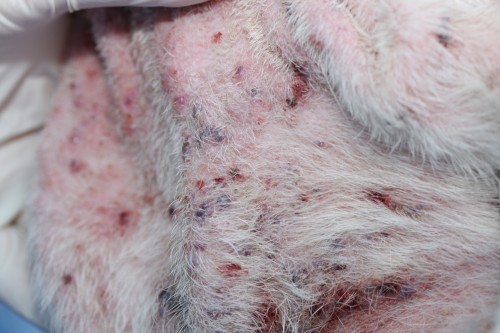 Photo 3 : Vue rapprochée de la face ventrale du cou. Noter les nombreux furoncles, l’érythème et l’alopécie.