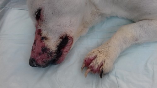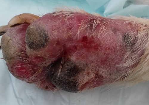 A distance la chienne présente un érythème sévère du chanfrein avec extension aux paupières inférieures et aux babines, avec une alopécie correspondant aux zones inflammatoires, à bord assez net décrivant une limite entre les zones atteintes et les zones indemnes (photos 1 et 2). Un squamosis et des plaques hyperpigmentées sont également présents. Des lésions identiques sont également observées sur 3 des 4 pieds, un antérieur et deux postérieurs et sur la zone péri-vulvaire (photos 3 et 4).