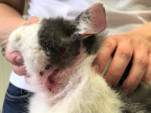 Bouba est un chat européen mâle castré de 9 ans référé car il présente depuis environ 2 mois un prurit sévère au niveau de la tête et du cou. De plus, la propriétaire rapporte également depuis peu des symptômes généraux, le chat est moins dynamique et son appétit est diminué. Il a reçu récemment 1 pipette de Stronghold 2 fois à 3 semaines d’intervalle et de la prednisolone à 1 mg/Kg/jour pendant 1 semaine permettant une amélioration modérée et temporaire du prurit.